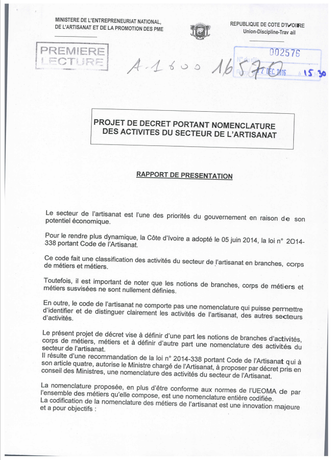 RAPPORT DE PRESENTATION DU PROJET DE DECRET PORTANT NOMENCLATURE DES ACTIVITES DU SECTEUR DE L’ARTISANAT