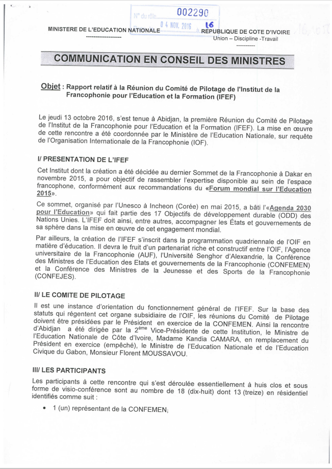 COMMUNICATION EN CONSEIL DES MINISTRES RELATIVE AU Rapport relatif à la Réunion du Comité de Pilotage de l'institut de la Francophonie pour l’Education et la Formation (IFEF)