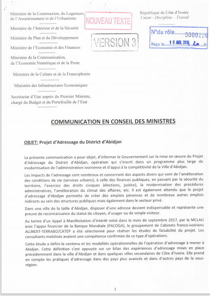 COMMUNICATION EN CONSEIL DES MINISTRES RELATIVE AU PROJET D'ADRESSAGE DU DISTRICT D'ABIDJAN