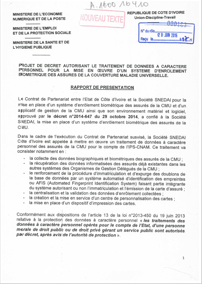 PROJET DE DECRET AUTORISANT LE TRAITEMENT DE DONNEES A CARACTERE PERSONNEL POUR LA MISE EN ŒUVRE D’UN SYSTEME D’ENROLEMENT BIOMETRIQUE DES ASSURES DE LA COUVERTURE MALADIE UNIVERSELLE.