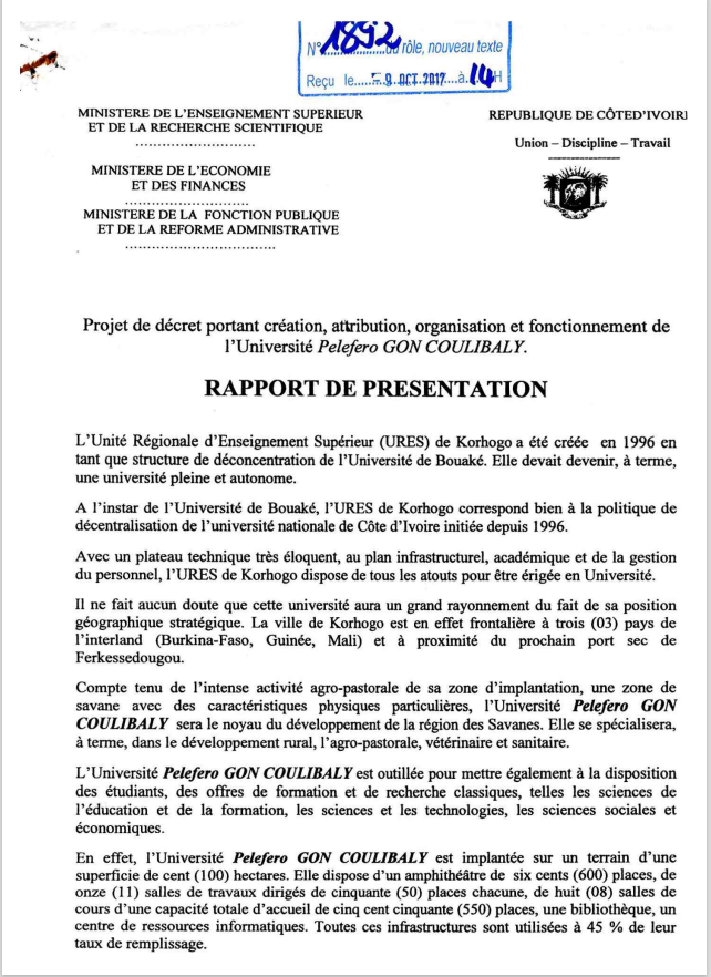 Rapport de présentation du Projet de décret portant création, attribution, organisation et fonctionnement de l’Université Pelefero GON COULIBALY.