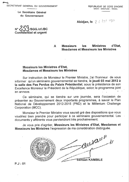 Courrier relatif au séminaire gouvernemental tenu le jeudi 03 mai 2012 à la salle des Pas Perdus du Palais Présidentiel,