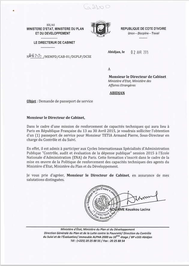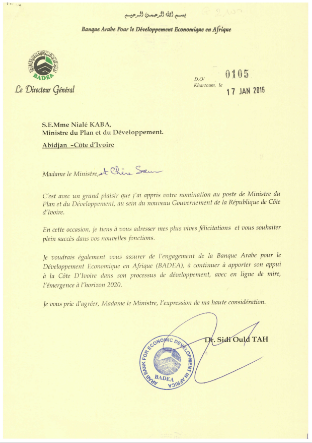 Courrier des félicitations relatives à la reconduction de Madame NIALE KABA en qualité de Ministre du Plan et du Développement.