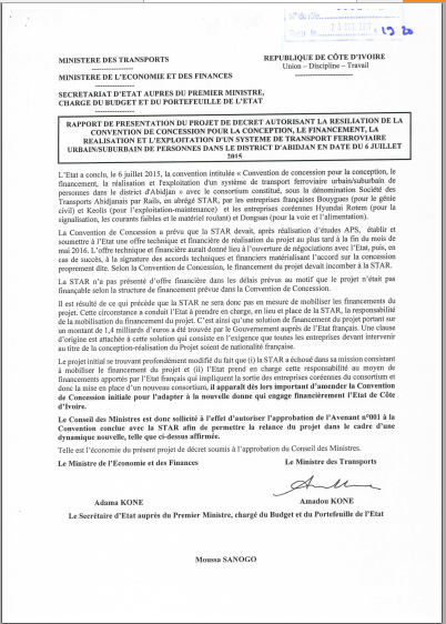 Rapport de présentation du projet de décret autorisant la résiliation de la convention de concession pour la conception le financement la réalisation et l'exploitation d'un système de transport ferroviaire urbain et suburbain de personnes