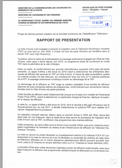Rapport de présentation relative au projet de décret portant création de la Société Ivoirienne de Télédiffusion Télévision