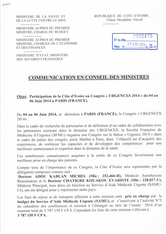 Communication en conseil des ministres relative à la Participation de la Côte d’ivoire au Congrès « URGENCES 2014 » du 04 au 06 Juin 2014 à PARIS (FRANCE).