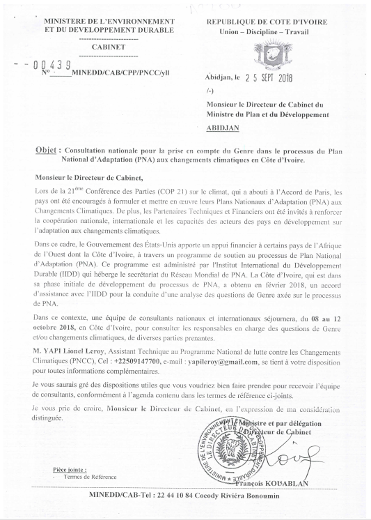 Consultation nationale pour la prise en compte du Genre dans Ie processus du Plan National d'Adaptation (PNA) aux changements climatiques en Côte d'Ivoire.