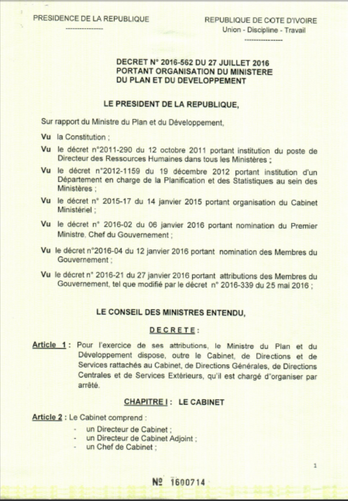 DECRET N° 2016-562 DU 27 JUILLET 2016 PORTANT ORGANISATION DU MINISTERE DU PLAN ET DU DEVELOPPEMENT