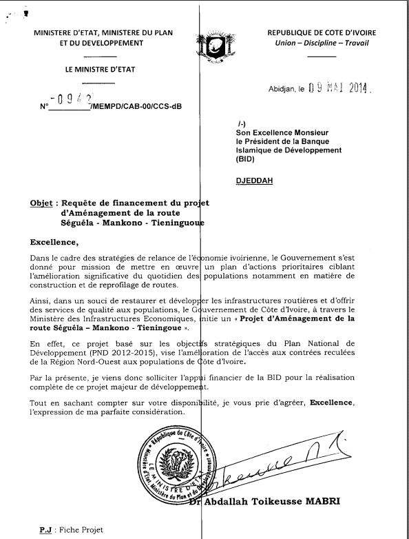 Requête de financement du projet d'Aménagement de la route Séguéla - Mankono - Tieninguoue