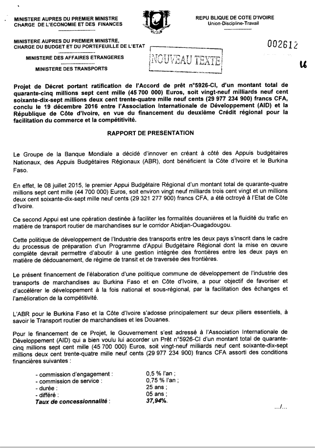 Projet de Décret portant ratification de l’Accord de prêt n°5926-CI, De 45 700 000Euros, conclu entre l’AID et la de Côte d'ivoire, en vue du financement du deuxième Crédit régional pour la facilitation du commerce et la compétitivité.