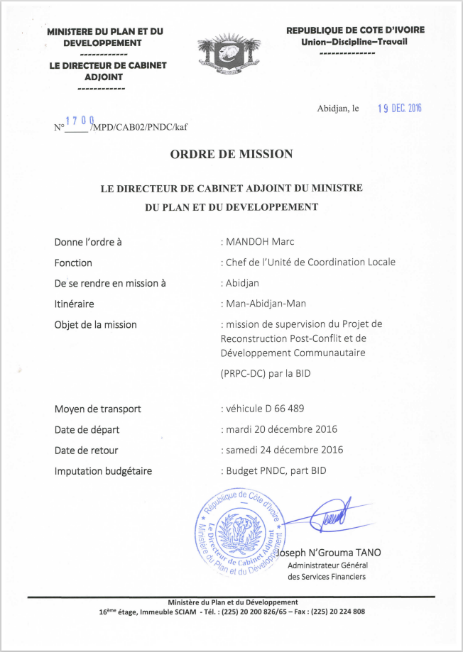 ORDRE DE MISSION DE MANDOH Marc RELATIF A LA mission de supervision du Projet de Reconstruction Post-Conflit et de Développement Communautaire (PRPC-DC) par la BID
