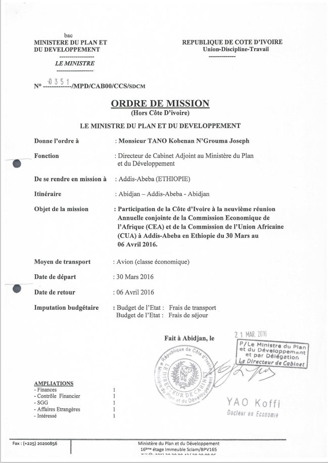 ORDRE DE MISSION DE TANO Kobenan N’Grouma Joseph Relatif à la Participation de la Côte d’ivoire à la 9e réunion Annuelle conjointe de la Commission Economique de l’Afrique (CEA) et de la Commission de l’Union Africaine (CUA) à Addis-Abeba en Ethiopie