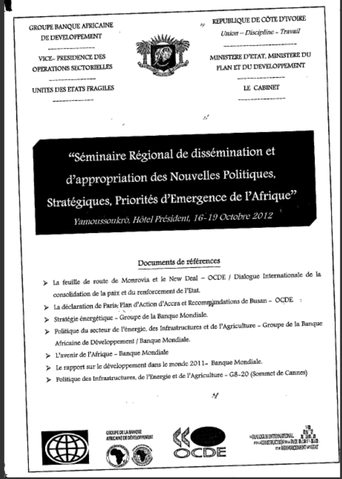 SEMINAIRE REGIONAL DE DISSEMINATION ET D'APPROPIATION DES NOUVELLES POLITIQUES STRATEGIQUES PRIORITES D'EMERGENCE DE L'AFRIQUE